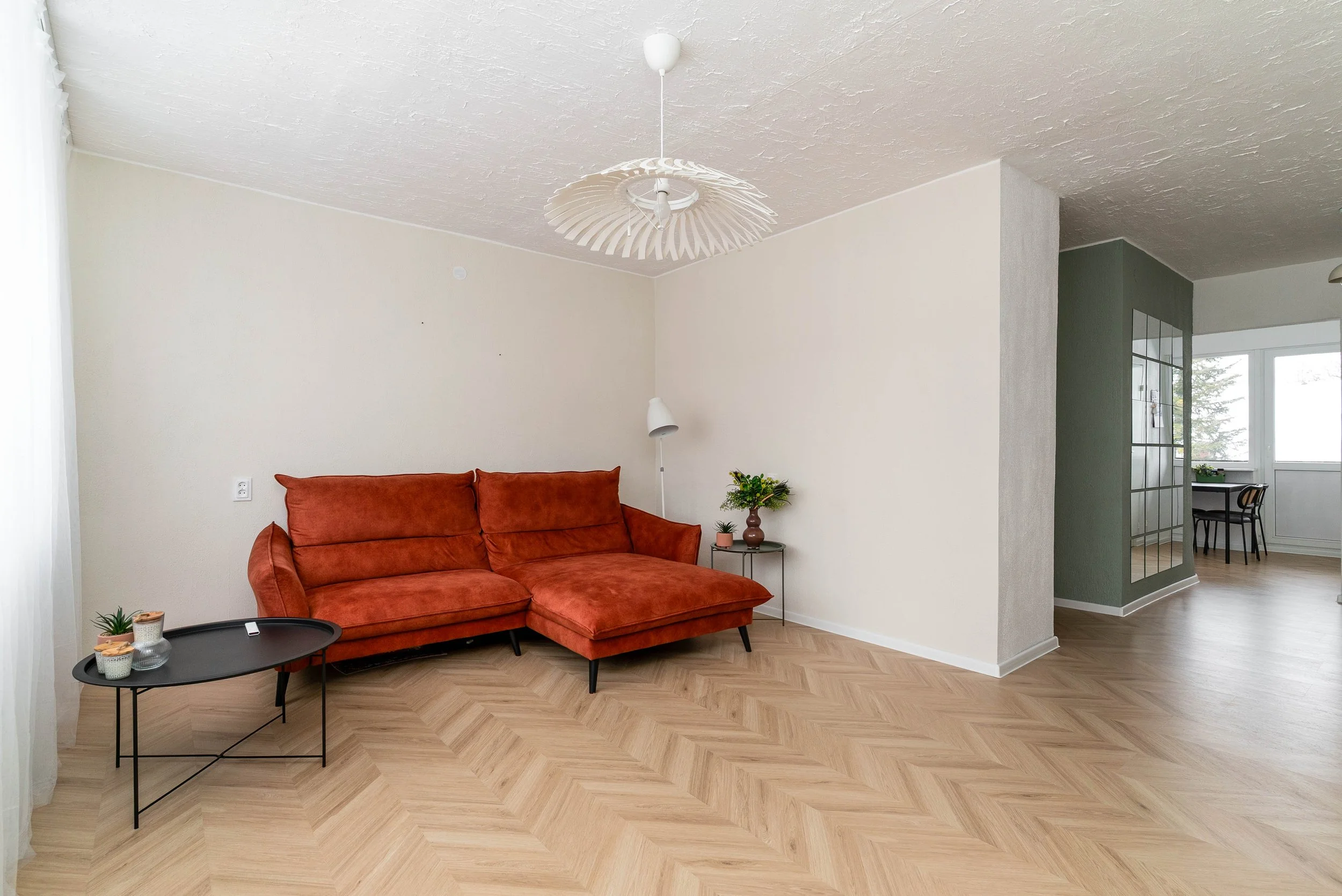 Korteri siseviimistlust on värskendatud 2025. aasta septembris, mille käigus viimistleti seinad uue tapeedi ja värviga ning paigaldati põrandale laminaatparkett. Paigaldati uued siseuksed. Samal ajal paigaldati ka kööki uus köögimööbel koos integreeritud retro stiilis ahjuga ja pliidiga brändilt SMEG.